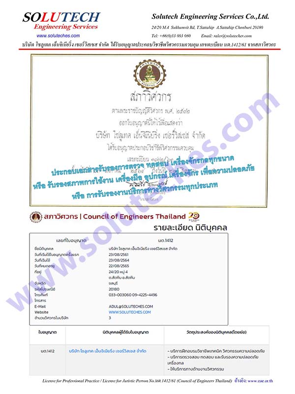 บริษัทโซลูเทค เอ็นจิเนียริ่ง จำกัด เป็นบริษัทที่ทำงานอยู่ในวงการอุตสาหกรรมงาน Inspection เครื่องจักรและเครน, อุตสาหกรรมงาน Lifting engineer services เราพุ่งเป้าไปที่การให้บริการที่มีคุณภาพ ทำความเข้าใจและสร้างความสัมพันธ์ที่ดีต่อลูกค้าในระยะยาว ในทุกงานบริการที่เราได้รับมอบหมาย โดยการทำงานอย่างใกล้ชิดกับทีมวิศวกรของลูกค้าอย่างราบรื่น เรามีความตระหนักและให้ความสำคัญถึงประสิทธิภาพสูงสุดและการลดค่าใช้จ่ายของลูกค้าให้ได้มากที่สุด ภารกิจของเราคือนำเสนอสิ่งที่เป็นประโยชน์ ประสบการณ์ที่น่าจดจำและผลลัพท์จากการทำงานที่โดดเด่นให้แก่ลูกค้า